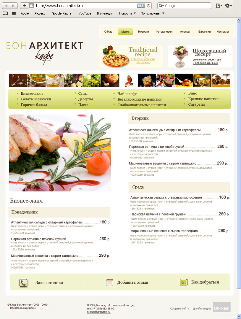 Кафе «БонАрхитект» - это сервис высшего уровня, разнообразное меню и приятные цены. При разработке сайта за основу был взят образ, который компания «БонАрхитект» создала для своей кофейни: легкий, демократичный, но при этом удобный и максимально практичный, поэтому сайт кафе «БонАрхитект» получился не только привлекательным на вид, но и удобным и информативным. На сайте кафе содержится вся необходимая посетителю информация: описание меню с указанием цен и граммажа блюд, подробная схема проезда. Помимо прочих удобств сайт предоставляет посетителю возможность осуществить онлайн-бронирование столика.