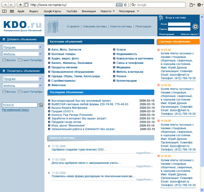 Главной целью разработки сайта является создание качественного ресурса, который бы помогал своим посетителям находить наиболее выгодные предложения по продаже или покупке услуг и товаров. Для решения этой задачи на сайт был внедрен специализированный механизм размещения объявлений, который помогает пользователю быстро найти нужную категорию и разместить объявление, а также удобная система информирования, благодаря которой свежие объявления дополнительно размещаются на главной странице.